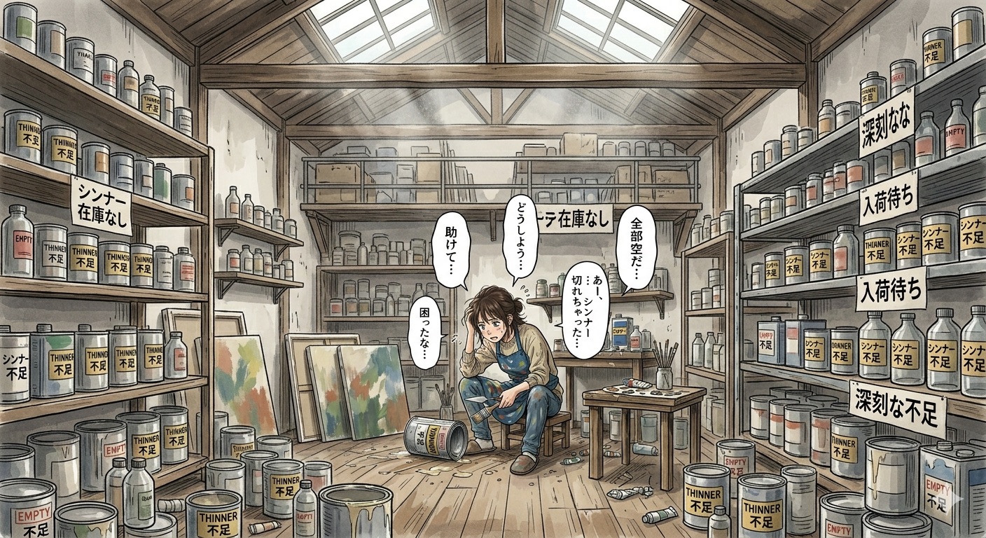 中東情勢の影響でナフサ(粗製ガソリン)由来のシンナーを中心に、資材の品薄や価格高騰に陥っております。
