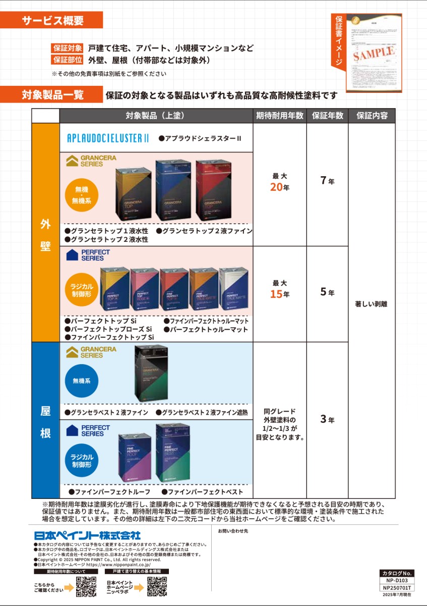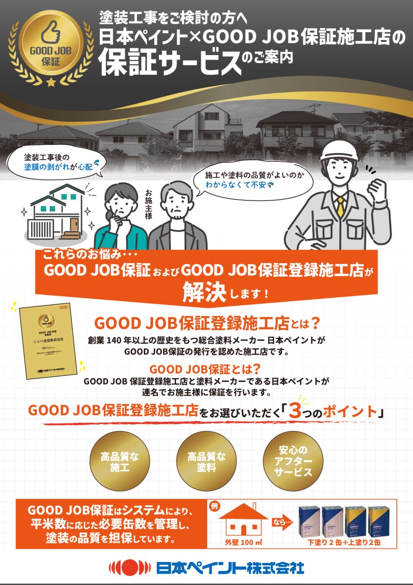 Trust Oneでは塗料メーカー(株)日本ペイントのメーカー認定施工店として選ばれ、お客様の安心・信用もさらにアップ!満足度向上に向けて今まで以上取り組んでまいります。GOOD JOB保証とは戸建住宅や小規模集合住宅などの塗り替え物件を対象に、塗装工事後に著しい剝離が発生した場合に対してTrust Oneと塗料メーカー(日本ペイント)が、連名でお施主様に保証を行うサービスです。お施主様に高品質な塗料と塗膜を提供し、保証という形で安心と信頼をお届けいたします。